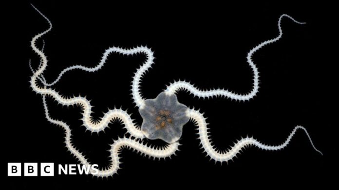 Natural History Museum/ University of Gothenburg A creature called a brittlestar. It has a grey, star-shaped body with orange segments in the middle, and five long legs with nodules like a centipede Natural History Museum/ University of Gothenburg