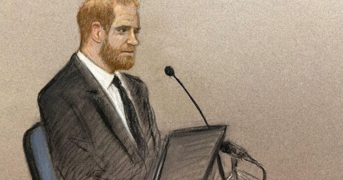 Britain’s Prince Harry gives evidence in his privacy lawsuit against the publisher of The Daily Mail, at the High Court in London, January 21, 2026, in this courtroom sketch.